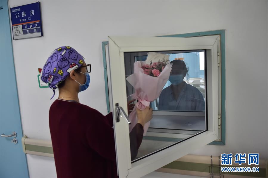 5月11日,在北京地壇醫(yī)院感染二科病房外,一名護士向病人轉(zhuǎn)交病人女兒送來的鮮花。北京地壇醫(yī)院是北京市收治新冠肺炎患者的定點醫(yī)院之一,醫(yī)院的醫(yī)護人員一直奮戰(zhàn)在抗擊疫情的一線。在國際護士節(jié)前夕,記者前往北京地壇醫(yī)院,記錄下抗疫一線護士的日常工作狀態(tài)。新華社記者彭子洋攝