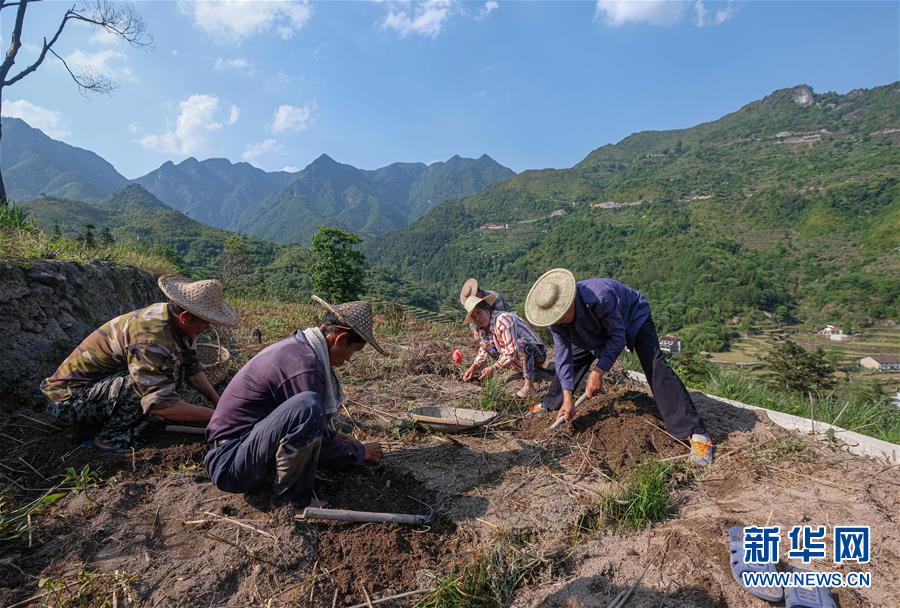5月12日,青田縣巨浦鄉(xiāng)西坑村的村民在梯田收獲中藥貝母。當(dāng)?shù)夭扇『献魃缂懈N,冬春種中藥、夏秋種養(yǎng)水稻和田魚的方式,全面提升土地利用率和收益。新華社記者徐昱攝