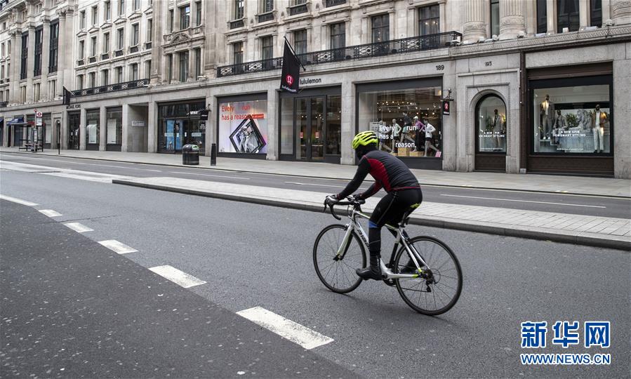 5月12日,在英國(guó)倫敦,一名男子騎行經(jīng)過(guò)攝政街關(guān)閉的店鋪。新華社記者韓巖攝