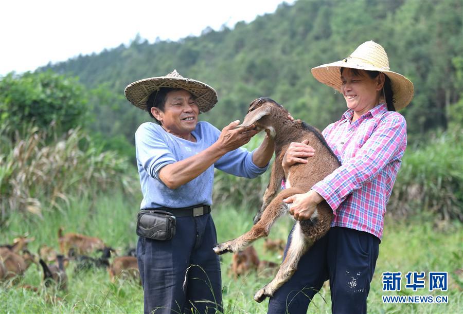 5月13日,在福建省建甌市小橋鎮(zhèn)陽澤村,村民呂元鑫(左)和妻子抱起一只小羊。62歲的呂元鑫曾因病返貧,2016年后通過扶貧貸款從事山羊養(yǎng)殖,現(xiàn)已還清貸款,每年養(yǎng)殖收入兩三萬元。新華社記者林善傳攝