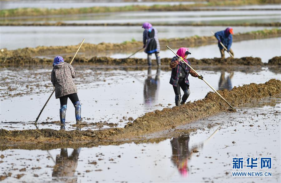 5月17日,在吉林省長春市雙陽區(qū)徐家村,農(nóng)民在水稻田間耕作。新華社記者許暢攝