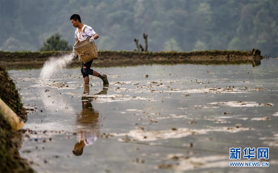 村民王九才在地里施肥(3月26日攝)。