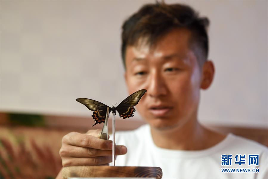 在吉木薩爾縣七彩蝶園,關(guān)富云在制作蝴蝶標本(5月15日攝)。走進關(guān)富云的七彩蝶園,游客不僅可以近距離接觸翩翩起舞的蝴蝶,還可以欣賞蝴蝶破繭成蝶的蛻變過程。今年34歲的關(guān)富云用9年的時間實現(xiàn)了自己的“蝴蝶夢”,完成美麗的“蝶變”。關(guān)富云家住新疆吉木薩爾縣北地社區(qū)。2011年,他看到一檔農(nóng)業(yè)致富節(jié)目,萌生了養(yǎng)殖蝴蝶的想法。關(guān)富云說,當時蝴蝶養(yǎng)殖還是一種新興產(chǎn)業(yè),他抱著試一試的想法,在海南學習了3個月蝴蝶養(yǎng)殖,帶回100多個蝶蛹在家試驗養(yǎng)殖。蝴蝶的生存周期短,在當?shù)仞B(yǎng)殖需要克服溫度、濕度、病蟲害等問題。關(guān)富云不斷嘗試,越挫越勇,羽化成功的蝴蝶在2014年終于突破了萬只。蝴蝶的色彩艷麗,活體蝴蝶可用于婚慶、開業(yè)慶典等活動中放飛,可以取得很好的收益。但它的生命短暫,如何才能最大化蝴蝶的效益,留住它的美呢?關(guān)富云動起了心思,開始嘗試制作標本和蝶翅畫?!昂宛B(yǎng)殖不同,做蝶翅畫是個創(chuàng)作的過程,從選擇標本到粘貼,每一步都要突出美感。”關(guān)富云介紹,一幅色彩明艷、栩栩如生的蝶翅畫耗時多日才能完成。如今,關(guān)富云的活體蝴蝶和蝶翅畫通過線上線下銷售,產(chǎn)品還銷往北京、廈門等地。關(guān)富云的蝴蝶產(chǎn)品得到市場的認可,政府也對他給予大力支持。2019年,吉木薩爾縣在泉子街鎮(zhèn)建起蝴蝶觀賞園,吸引了不少游客到此參觀游玩。對于未來的發(fā)展,關(guān)富云信心滿滿,“我希望把蝴蝶產(chǎn)業(yè)發(fā)展到天山南北,讓人們在寒冷的冬季也能觀賞到蝴蝶,并且讓更多人參與其中,致富脫貧”。新華社記者丁磊攝