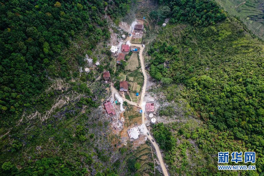 這是大化瑤族自治縣七百弄鄉(xiāng)弄合村弄根屯在進(jìn)行危房改造和修建進(jìn)屯路(5月13日攝,無人機(jī)照片)。