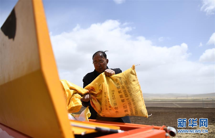 在青海省海北藏族自治州海晏縣青海湖鄉(xiāng)同寶村,者成倉準(zhǔn)備播種(5月13日攝)。新華社記者張宏祥攝