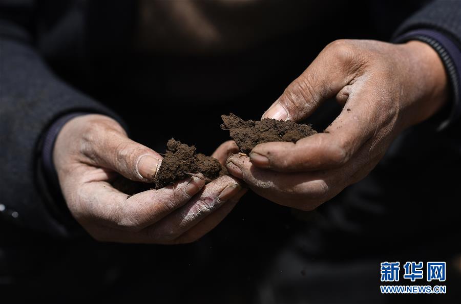 在青海省海北藏族自治州海晏縣青海湖鄉(xiāng)同寶村,者成倉在地里查看土壤狀況(5月13日攝)。新華社記者張宏祥攝