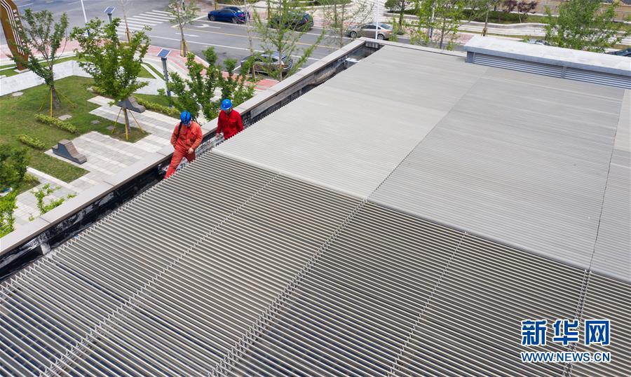 5月21日,工作人員在巡查“城市客廳”屋頂光伏設(shè)備并網(wǎng)情況(無人機(jī)照片)。新華社記者徐昱攝