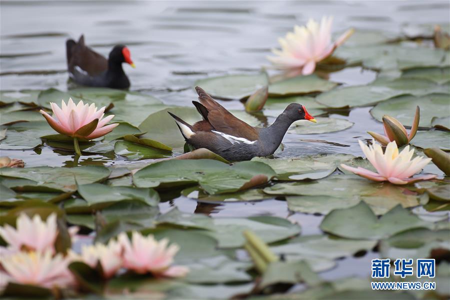 5月22日,兩只紅嘴水雞在蓮葉間游弋。近日,貴陽市觀山湖公園內(nèi)大片盛開的蓮花吸引了不少水鳥在其間嬉戲覓食。新華社記者劉續(xù)攝
