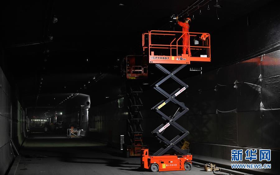 5月23日,工人在??谖拿鳀|越江通道項目隧道內(nèi)安裝照明設(shè)備。新華社記者楊冠宇攝