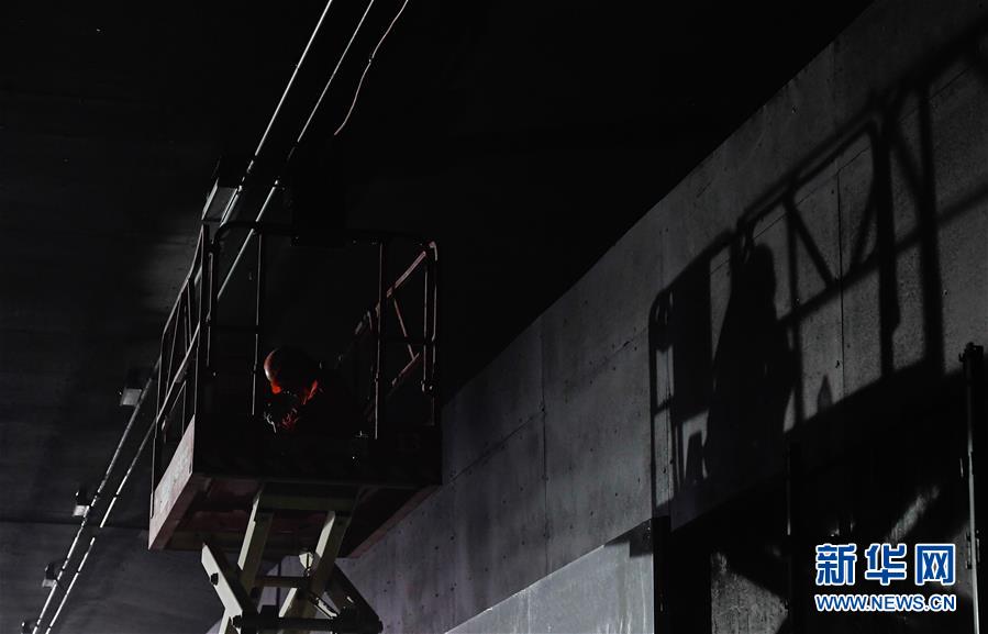 5月23日,工人在??谖拿鳀|越江通道項(xiàng)目隧道內(nèi)安裝照明設(shè)備。新華社記者楊冠宇攝