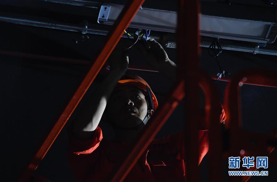 5月23日,工人在??谖拿鳀|越江通道項(xiàng)目隧道內(nèi)安裝照明設(shè)備。新華社記者楊冠宇攝