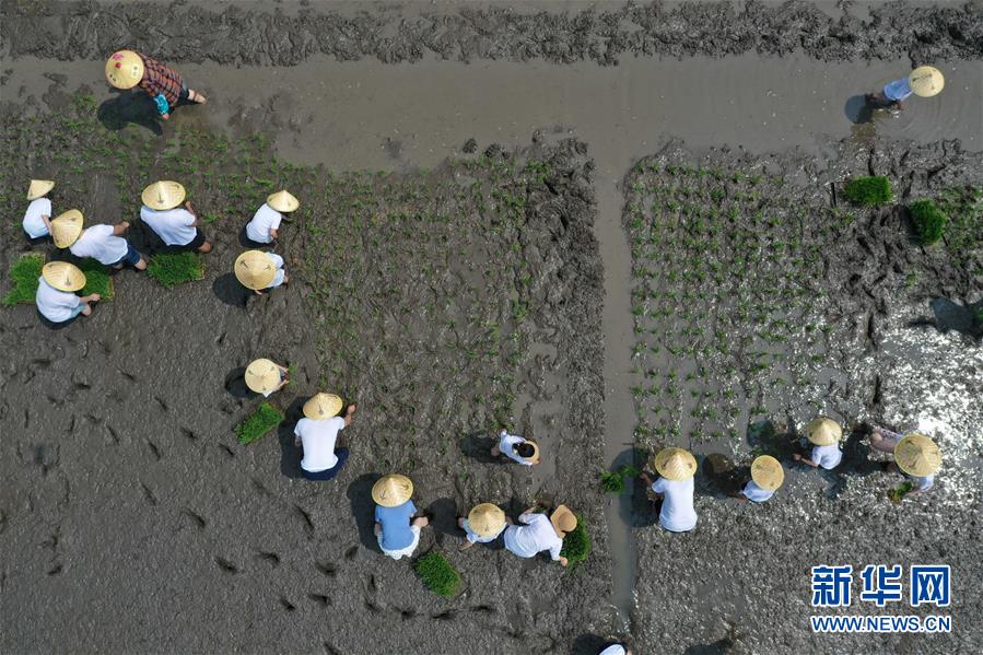 5月24日,小朋友與家長在稻田里參加親子插秧比賽(無人機照片)。當日,十余名小朋友在家長的帶領下來到浙江省湖州市吳興區(qū)八里店鎮(zhèn)尹家圩糧油植保農(nóng)機專業(yè)合作社的稻田中,參加親子插秧、稻田捉魚等農(nóng)事體驗活動。新華社記者黃宗治攝