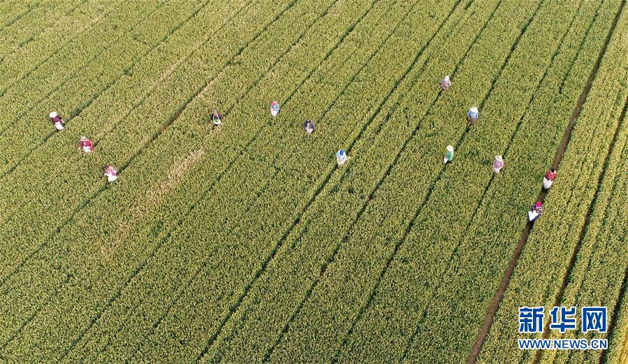 5月26日,農(nóng)民在內(nèi)丘縣東龐前街村麥田清理雜麥(無人機(jī)照片)。夏日時節(jié),河北省邢臺市內(nèi)丘縣農(nóng)民搶抓農(nóng)時開展麥田后期管理,為小麥增產(chǎn)豐收打好基礎(chǔ)。新華社記者朱旭東攝