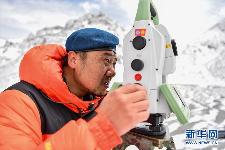 當(dāng)日,2020珠峰高程測(cè)量登山隊(duì)成功登頂后,在珠峰大本營(yíng)的珠峰高程起算點(diǎn),自然資源部第一大地測(cè)量隊(duì)隊(duì)員利用全站儀等儀器對(duì)珠穆朗瑪峰峰頂進(jìn)行交會(huì)觀測(cè)。