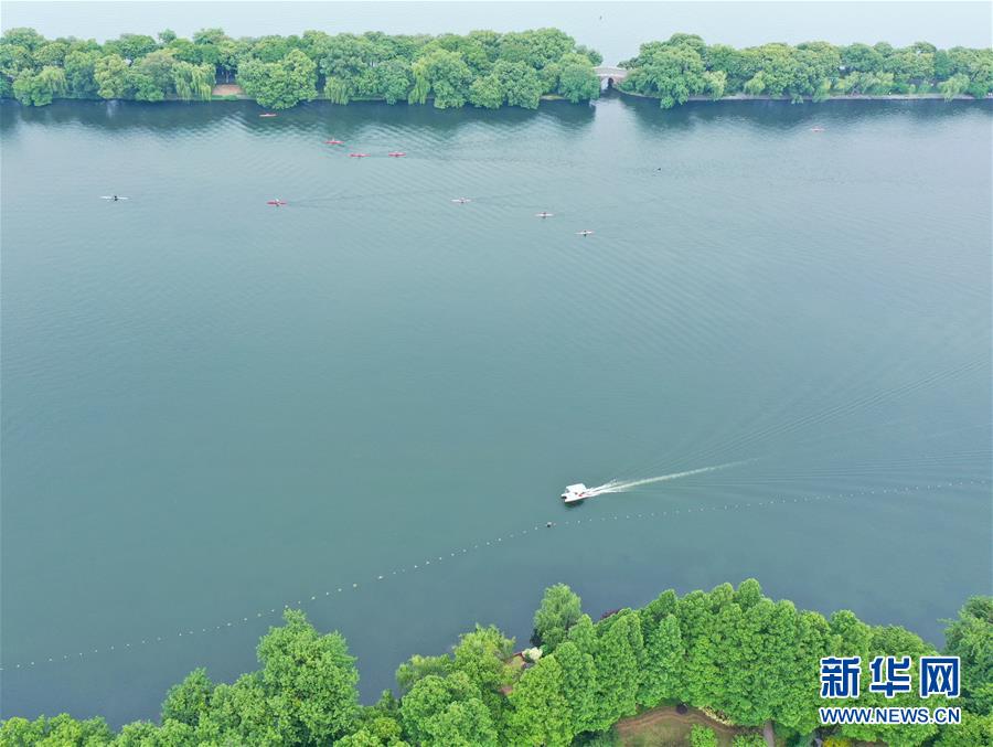 5月27日,船只在西湖上行駛(無人機(jī)照片)。隨著氣溫升高,杭州西湖綠意蔥蘢,展現(xiàn)出柔美的湖光山色。新華社記者翁忻旸攝