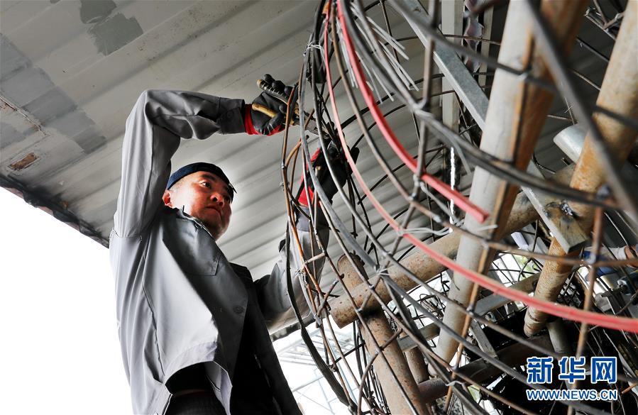 5月27日,制作團隊成員李剛在中轉服務站工棚內,用廢舊鋼絲制作牛造型工藝品的身體部分。新華社記者方喆攝