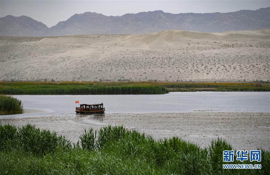 5月20日,在新疆博湖縣一處景區(qū)內,一艘游船穿梭于葦叢間。新華社記者宋彥樺攝