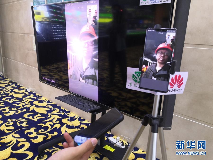 在山西陽煤集團新元煤礦調度中心,記者通過5G網絡視頻采訪井下礦工(5月27日手機拍攝)。新華社記者梁曉飛攝