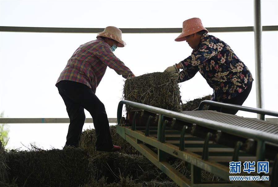 在平頂山市葉縣常村鎮(zhèn)月臺(tái)村扶貧車(chē)間倉(cāng)庫(kù),村民整理打好捆的艾草(5月27日攝)。