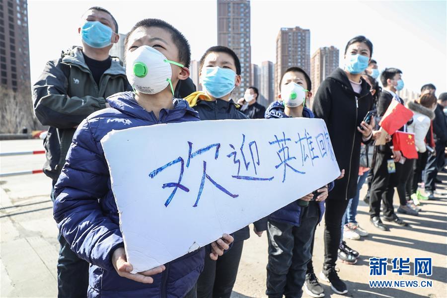 遼寧沈陽(yáng)一高速公路出口,男孩們列隊(duì)歡迎遼寧對(duì)口支援襄陽(yáng)醫(yī)療隊(duì)歸來(lái)(3月21日攝)。新華社記者潘昱龍攝