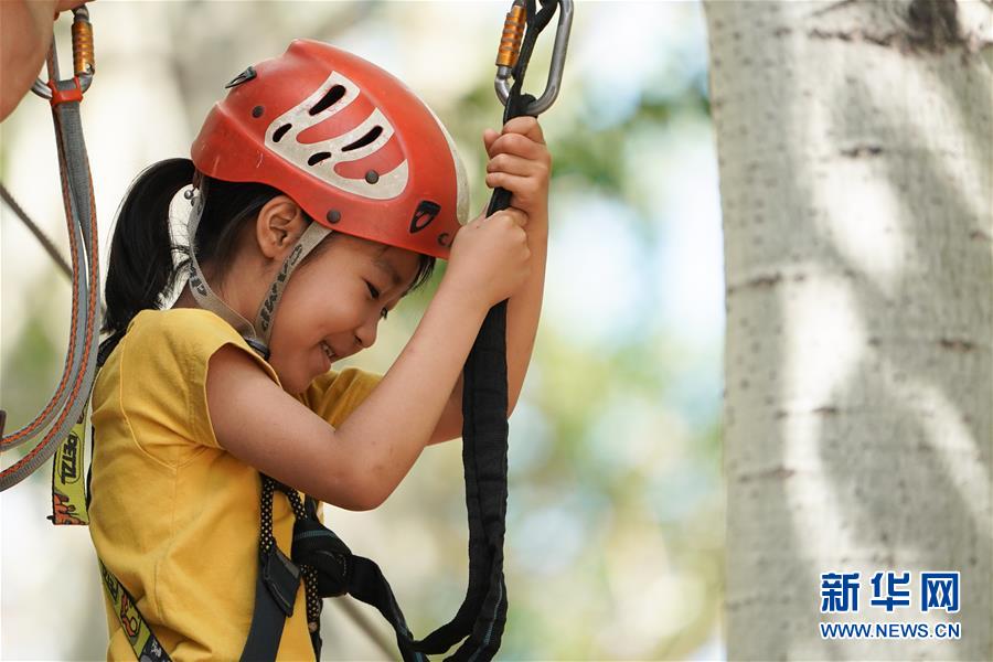 5月31日,小朋友在北京朝陽公園體驗戶外運動。