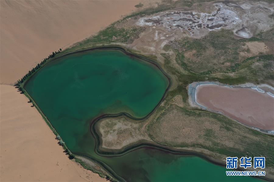 這是5月30日拍攝的巴丹吉林沙漠一處湖泊(無(wú)人機(jī)照片)。新華社記者徐欽攝。