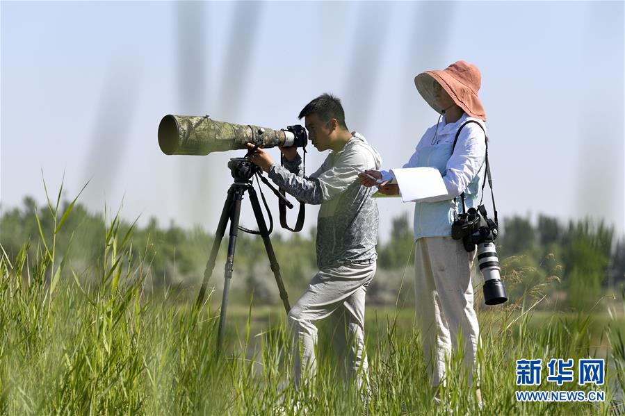 6月3日,李學(xué)明(左)和同事張海榮在監(jiān)測記錄黃河濕地的鳥類活動。新華社記者馮開華攝。