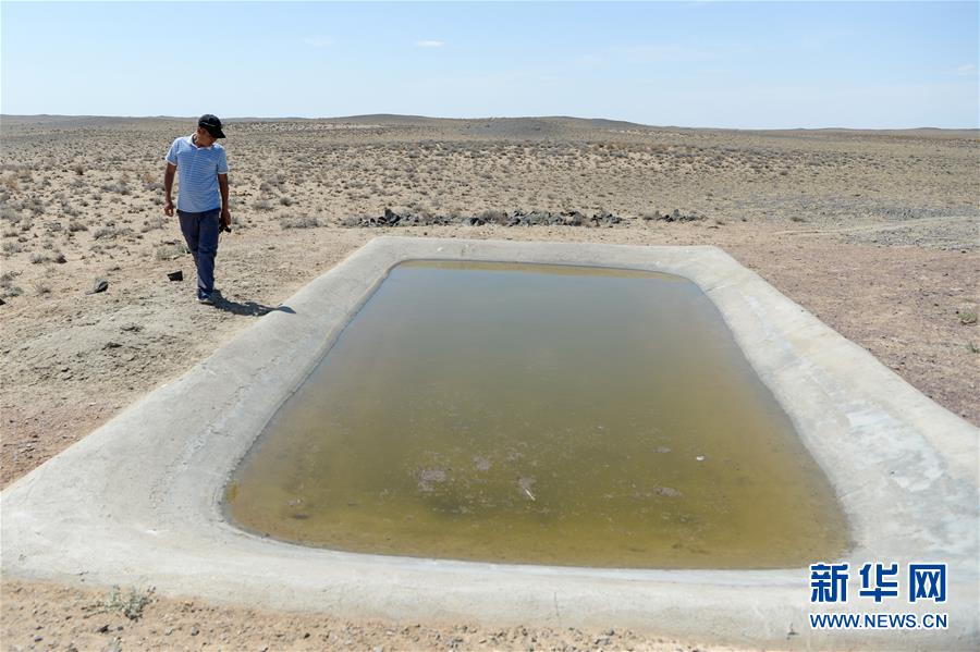 在新疆卡拉麥里山有蹄類野生動物自然保護區(qū),管護員阿達(dá)比亞特來到人工建設(shè)的水池查看蓄水情況(6月3日攝)。新華社記者丁磊攝。
