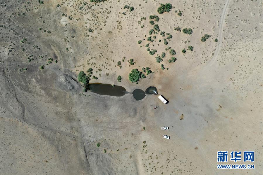 在新疆卡拉麥里山有蹄類野生動(dòng)物自然保護(hù)區(qū),管護(hù)員為水源地灌水(6月3日攝,無(wú)人機(jī)照片)。新華社記者丁磊攝。
