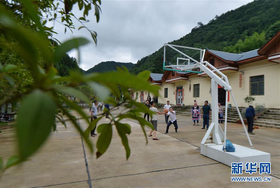 6月3日,人們在永州市新田縣兩江口村易地搬遷集中安置點(diǎn)內(nèi)打籃球。新華社記者趙眾志攝。