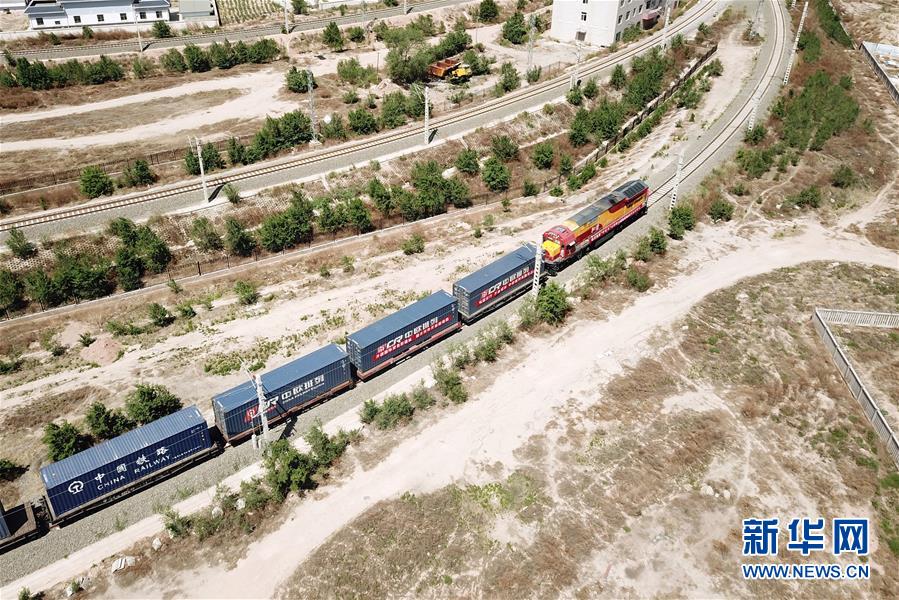 6月5日,在甘肅蘭州國(guó)際陸港,“中吉烏”公鐵聯(lián)運(yùn)國(guó)際貨運(yùn)班列準(zhǔn)備發(fā)車(無(wú)人機(jī)照片)。新華社記者范培珅攝。