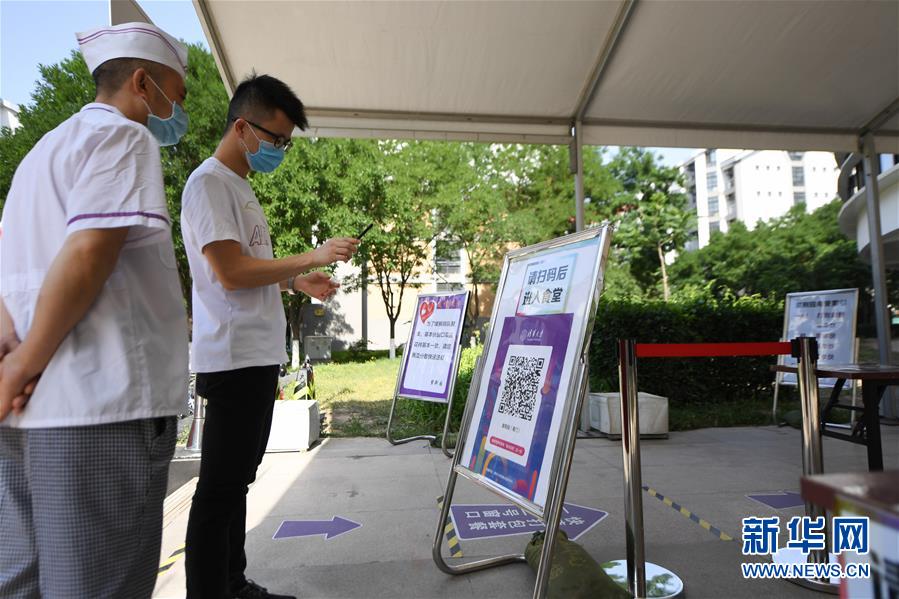 6月6日,在清華大學(xué)紫荊園食堂,學(xué)生掃碼驗(yàn)證信息后進(jìn)入食堂。 新華社記者 鞠煥宗 攝