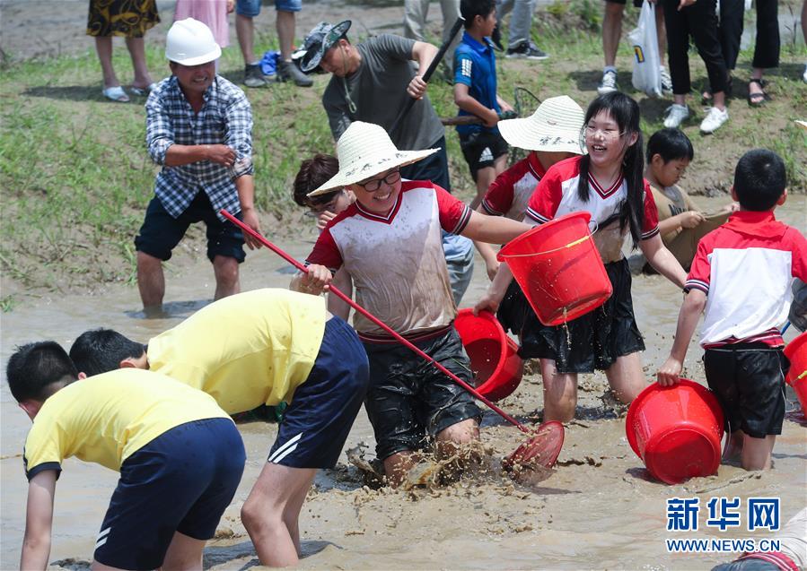 6月7日,孩子和家長們參加渾水摸魚趣味活動。新華社記者徐昱攝