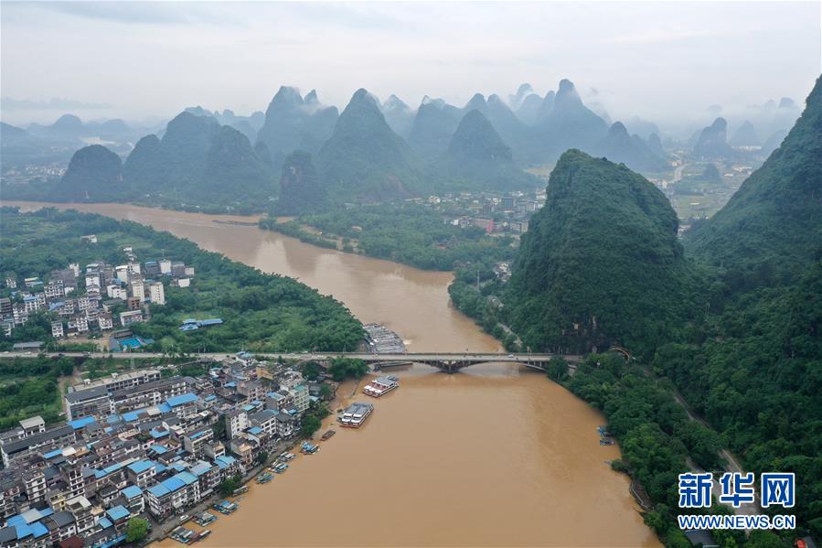 這是洪水奔流的漓江流過廣西陽朔縣境內(nèi)(6月8日攝,無人機照片)。6月6日至8日,廣西陽朔縣普降暴雨,局部降特大暴雨,全縣9個鄉(xiāng)鎮(zhèn)出現(xiàn)洪澇災(zāi)害。目前,全縣正有序開展災(zāi)后生產(chǎn)生活恢復(fù)。新華社記者陸波岸攝