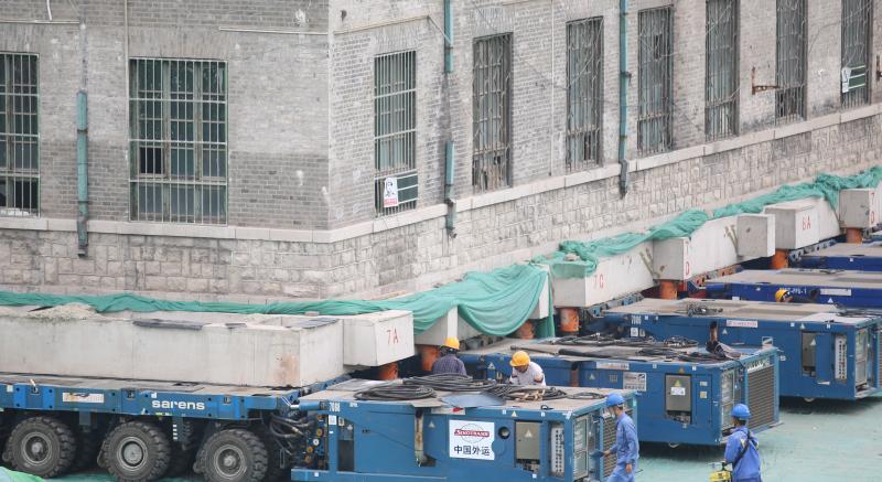2020年6月9日,濟(jì)南在歷山路與東關(guān)大街交叉口,液壓模塊拖車在修女樓底部做好平移準(zhǔn)備。