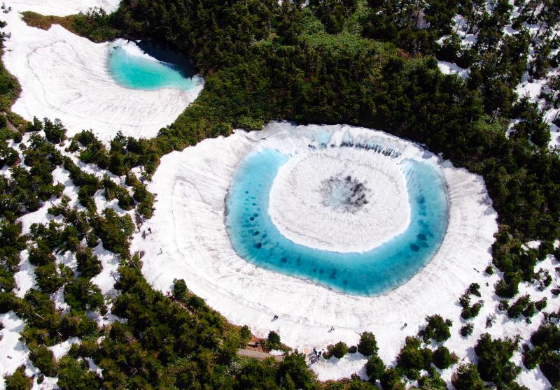當(dāng)?shù)貢r(shí)間2020年6月8日,日本,在橫跨巖手縣與秋田縣的八幡平山頂附近的“鏡沼”,伴隨著“鏡沼”的積雪從外側(cè)逐漸融化,外圍的碧藍(lán)色湖水與中心部的潔白積雪相映成趣,呈現(xiàn)出獨(dú)特的類似“龍眼”的景象。據(jù)悉,八幡平“龍眼”奇景只在每年5月下旬至6月初的雪融期間短暫出現(xiàn)。