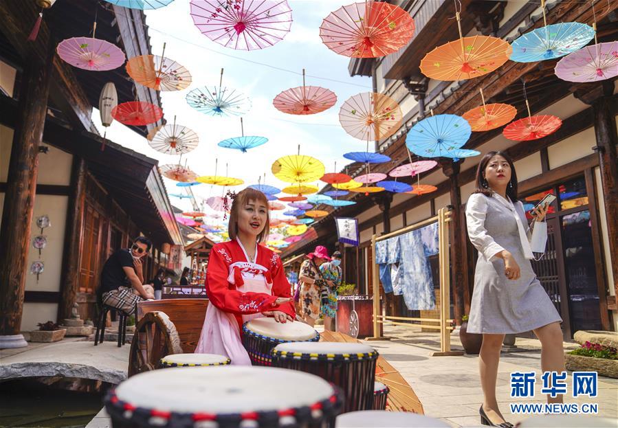 6月13日,在長春市世茂蓮花山小鎮(zhèn)寬厚里商街,一名古裝愛好者演奏手鼓。當(dāng)日是“文化和自然遺產(chǎn)日”。吉林長春首屆蓮花山消夏生活節(jié)在世茂蓮花山小鎮(zhèn)舉行?;顒訉⒎沁z展示與假日消暑休閑相結(jié)合,讓游人在“古色古香”的油紙傘巷中品傳統(tǒng)文化魅力,享夏日休閑愜意。新華社記者 許暢 攝