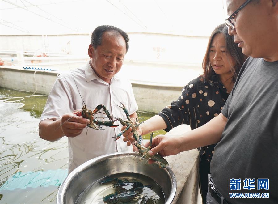 6月16日,在盧龍縣印莊鄉(xiāng)榆林甸村永新水產養(yǎng)殖專業(yè)合作社的養(yǎng)殖基地,養(yǎng)殖戶劉玉永(左)與河北省海洋與水產科學研究院科研人員探討澳洲淡水龍蝦養(yǎng)殖技術。新華社記者 楊世堯 攝