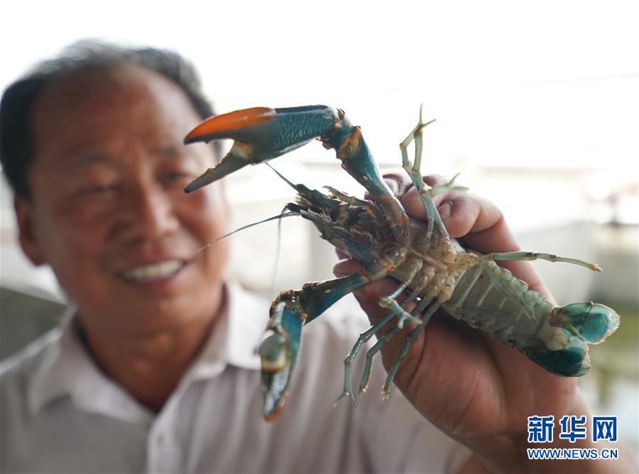 6月16日,在盧龍縣印莊鄉(xiāng)榆林甸村永新水產養(yǎng)殖專業(yè)合作社的養(yǎng)殖基地,養(yǎng)殖戶劉玉永在展示一只澳洲淡水龍蝦。新華社記者 楊世堯 攝