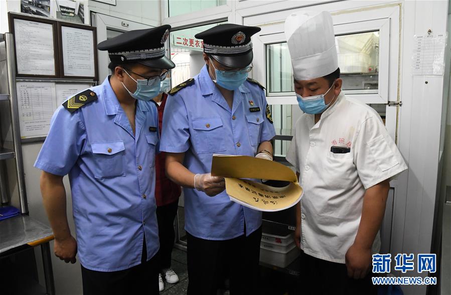 6月17日,在位于北京市海淀區(qū)的海碗居增光路店,執(zhí)法人員在檢查后廚的消毒記錄。
