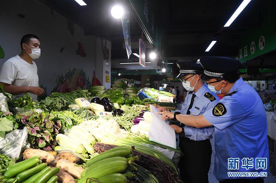 6月17日,在位于北京市海淀區(qū)的增光鴻運(yùn)市場(chǎng),執(zhí)法人員對(duì)商戶所售蔬菜的進(jìn)貨渠道進(jìn)行檢查。新華社記者 任超 攝