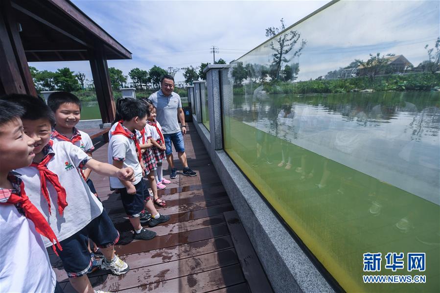 6月17日,洛舍鎮(zhèn)中心學(xué)校的師生們參觀水情館的室外園區(qū)。新華社記者 徐昱 攝