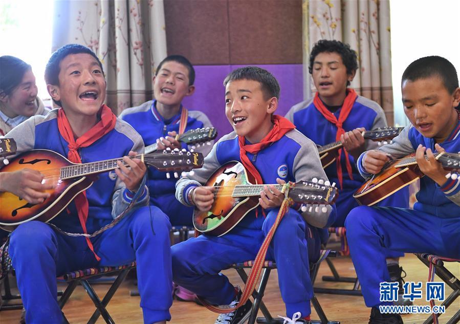 6月14日,孩子們?cè)诎慰h民族寄宿制小學(xué)內(nèi)的少年宮里用曼陀鈴進(jìn)行彈唱。新華社記者 劉坤 攝