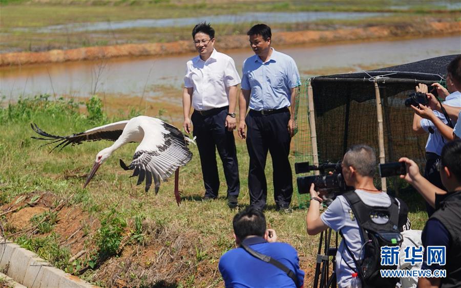 三只東方白鸛鄱陽(yáng)湖畔放歸自然