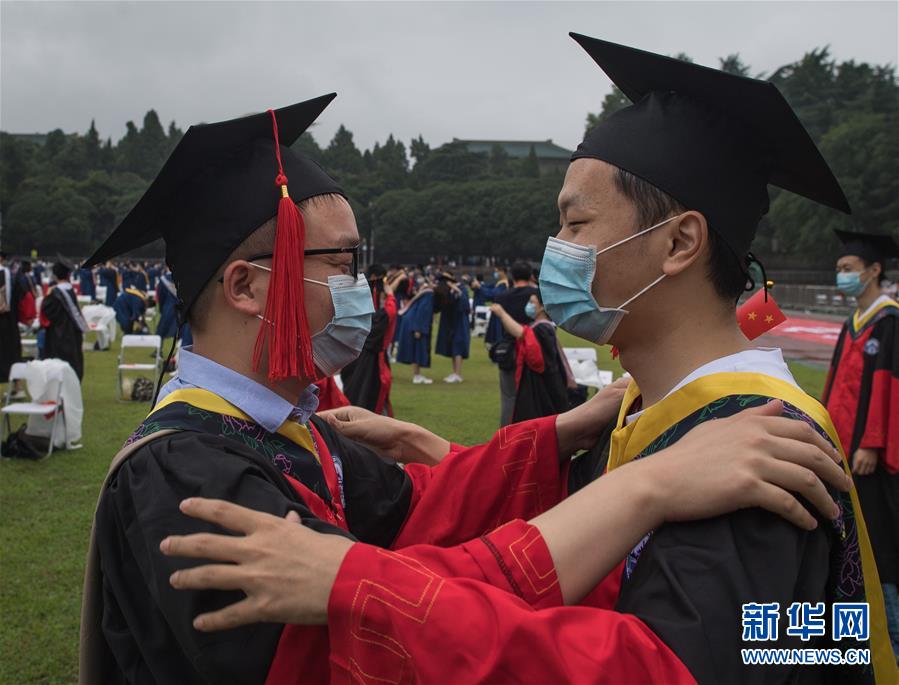 6月20日,武漢大學(xué)畢業(yè)生在畢業(yè)典禮上互相整理學(xué)位服。新華社記者 肖藝九 攝