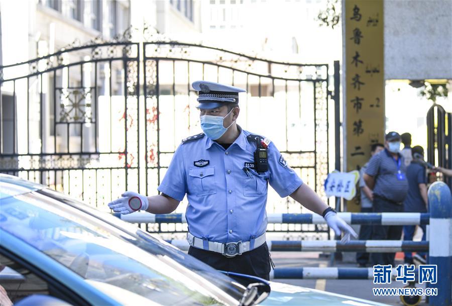 6月20日,在烏魯木齊市第二中學(xué)門前,烏魯木齊市公安局交警支隊(duì)天山區(qū)大隊(duì)新華路中隊(duì)警官羅曉亮在指揮交通。當(dāng)日,烏魯木齊市初中升高中考試開始。為保障為期三天的中考順利進(jìn)行,烏魯木齊市公安局交警支隊(duì)在各考點(diǎn)執(zhí)勤,為考生保駕護(hù)航新華社記者 王菲 攝