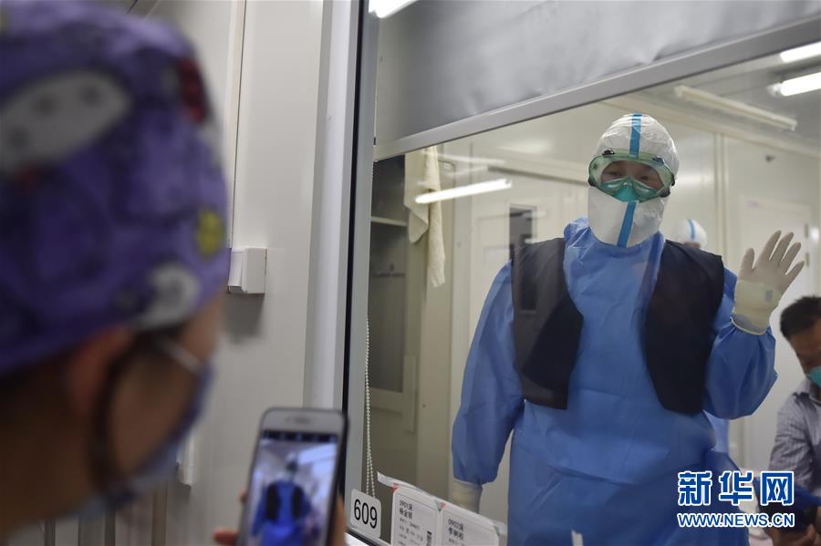 6月19日,在北京地壇醫(yī)院隔離病房內(nèi),護士穿上同事送來的降溫馬甲后,向同事打招呼感謝。新華社記者彭子洋攝