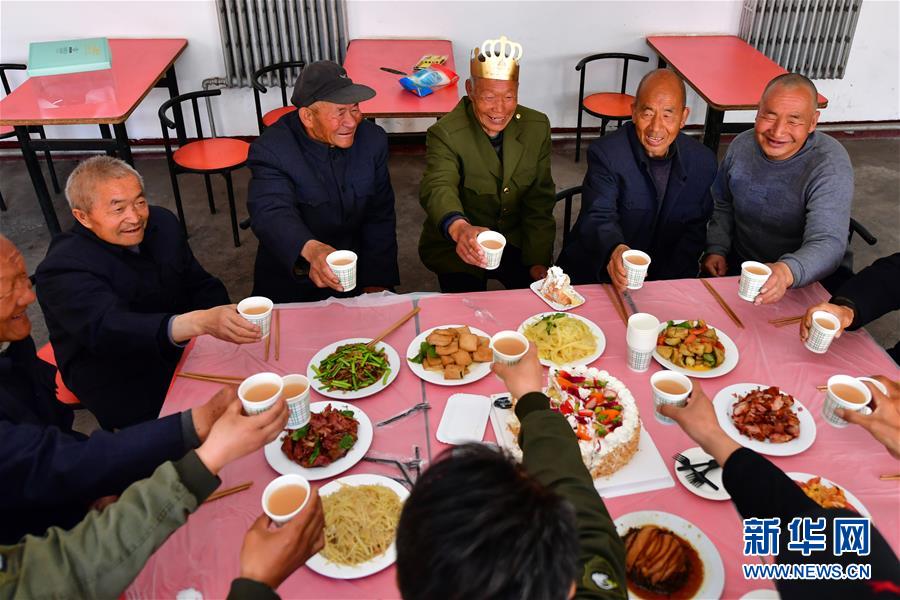 山西省壺關(guān)縣石坡鄉(xiāng)雙井村的“五保戶”李松興(右三)在石坡鄉(xiāng)養(yǎng)老院過(guò)生日(4月22日攝)。新華社記者曹陽(yáng)攝