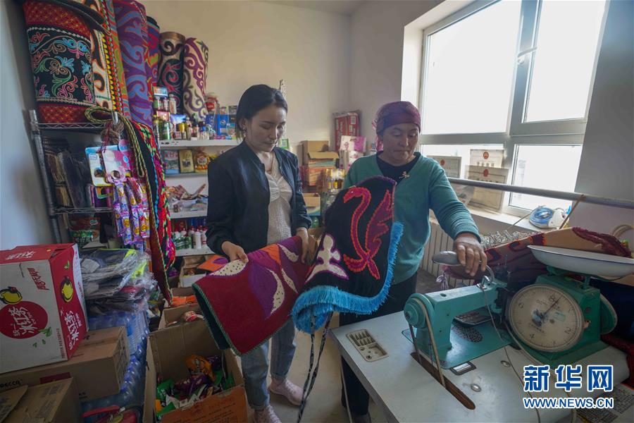 在吉木乃縣萬駝園內(nèi),古麗丁·米拉木別克(左)和母親在自家的超市里整理商品(6月21日攝)。新華社記者趙戈攝