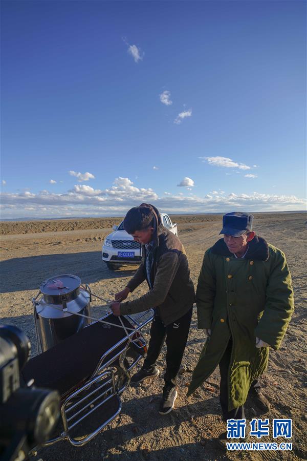 在吉木乃縣萬駝園內(nèi),牧民米拉木別克·阿依提克(右)在兒子的幫助下準(zhǔn)備騎著摩托車去交駝奶(6月21日攝)。新華社記者趙戈攝